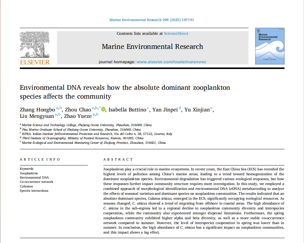 近日,学院周超老师研究团队和意大利国家环境保护研究所Isabella Buttino研究团队在《Marine Environmental Research》线上发表了题为《Environmental DNA Reveals How the Absolute Dominant Zooplankton Species Affects the Community》。该期刊是环境科学与生态学领域历史最悠久、最有影响力的国际期刊之一。此项研究以长江口近岸海域为研究区域,于2022年春季和夏季采集浮游动物样本,采用宏基因组与人工鉴定相结合的方式...