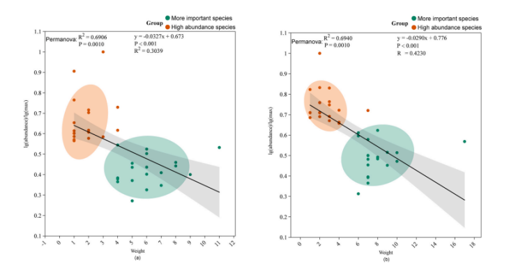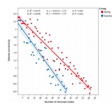 同时,通过建立浮游动物共生网络以及对浮游动物相对丰度的分析,本文发现,绝对优势种对季节过渡的适应能力以及其自身的高丰度影响了浮游动物共生网络的稳定性,同时压缩了其他物种的生存空间,加剧了群落内竞争。