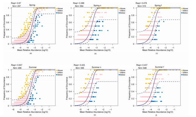 本文将采样区域分为近岸区域与远离海岸区域,并对比不同子区域间浮游动物群落构成差异。通过对群落多样性的分析以及构建中性群落模型(NCM),本文发现,绝对优势种的丰度和分布对浮游动物群落组成以及群落扩散能力有一定影响。